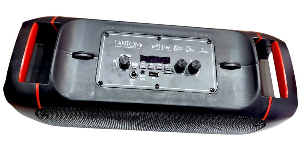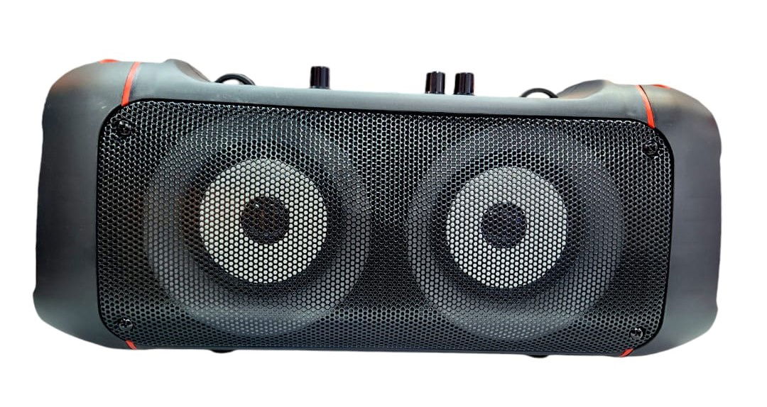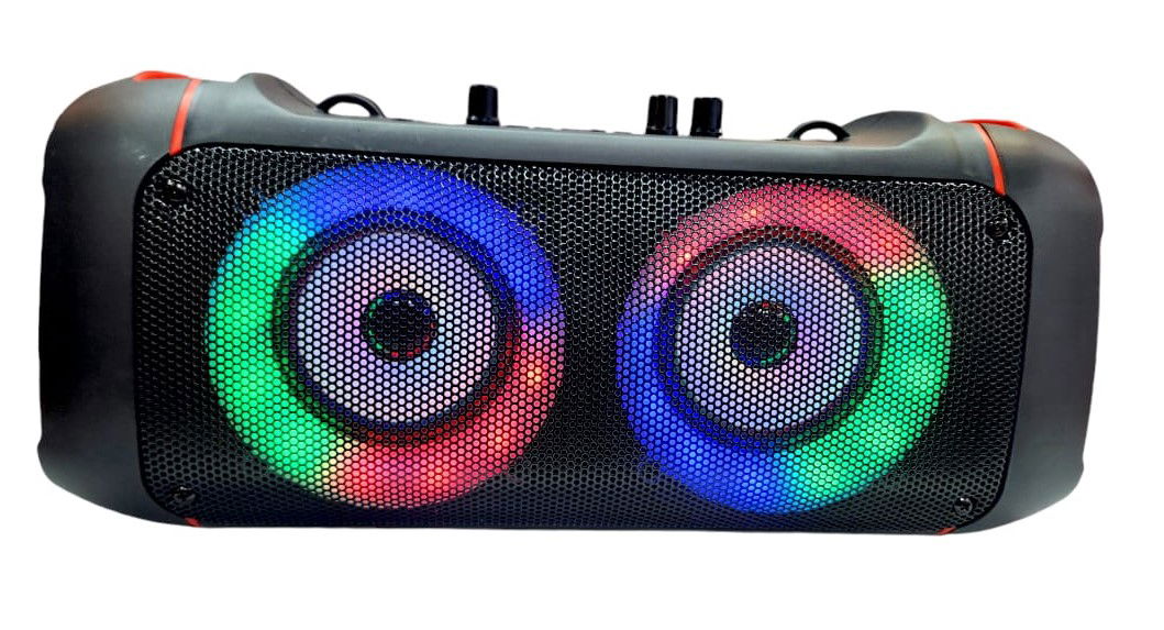 Parlante Bluetooth portátil formato horizontal con manijas de agarre en ambos extremos. Sonido Stéreo HIFI ultra HD Sound. Luces Led estilo fiesta, slot para tarjeta, entrada aux 3,5mm, entada USB.- entrada microfono- volúmen ECHO - Volúmen MIC. 2 Woofer de 4" -1200MAH - Incluye correa para transportar + Micrófono con cable + Control remoto+ cable de carga. Compatible con Android e IOS. Dimensiones: 39x14x16cm